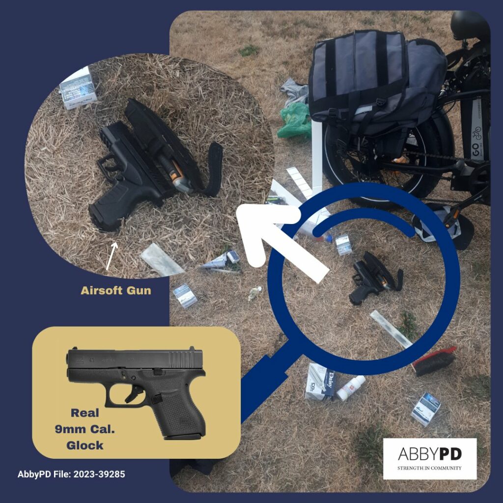 At about 5:30 A.M., AbbyPD patrol officers responded to a reported weapons call in the 2100 block of Sandalwood Cres. safely arresting the suspect armed with the above-pictured airsoft firearm.