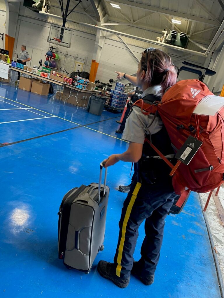 Members, heavy with personal effects and police equipment, entered the drill hall at PRTC where they were greeted by an employee. The officers provided their personal details and were given a radio call sign. This call sign, unique to the officer, will follow them once they are in the fire zone. Each member is given a radio, then it’s off to the supply table where they pick up safety masks, a “go-kit” full of snacks, water and toiletries, which allows the officer to be self-sufficient while deployed. These kits were kindly pulled together at a moment’s notice with the generosity of local businesses including the Chilliwack Walmart and London Drugs.