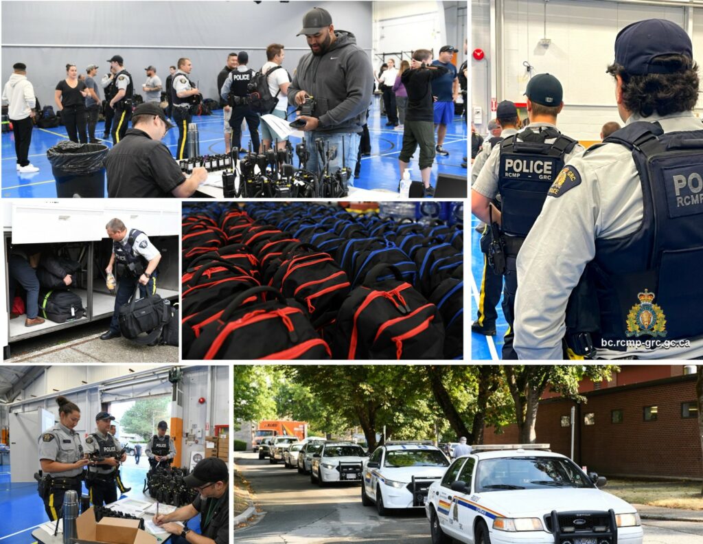 Chilliwack – On Wednesday August 23, RCMP officers from the Lower Mainland and Vancouver Island mustered at the Pacific Regional Training Centre (PRTC) in Chilliwack to deploy to wildfires.
