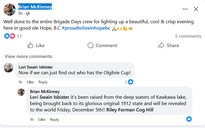 On line posts indicated that Brian McKinney and Cog Hill found the cup. Hill is Owner/ operator at Top Water Guide Services and Swiftwater Tech at Hope Volunteer Search and Rescue among other things on his resume.