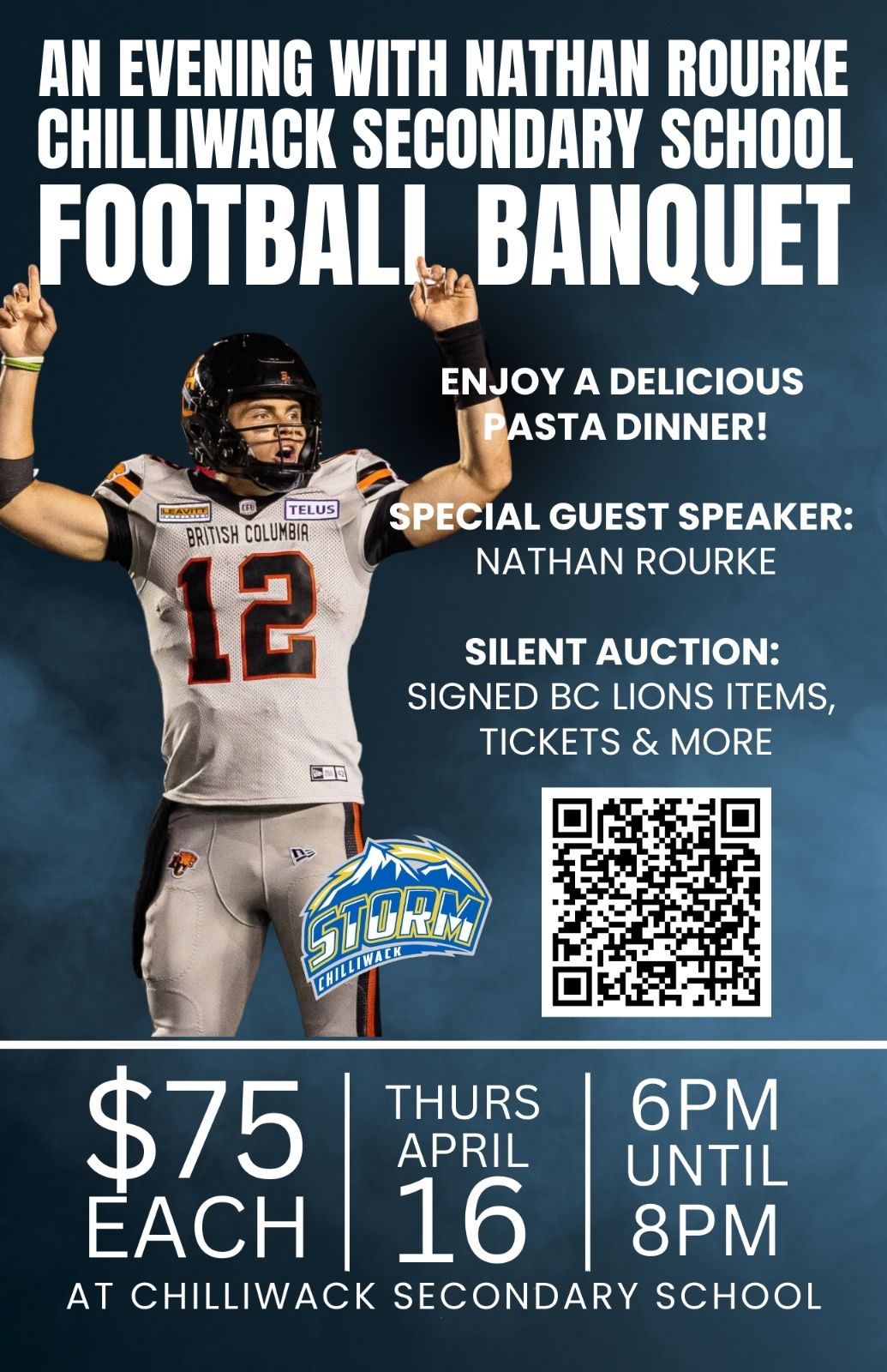 Join CSS Storm High School Football for An Evening with Nathan Rourke at the Chilliwack Secondary School Football Banquet! This special night brings together football fans, community supporters, and future athletes for an incredible evening celebrating the game and supporting local high school football.