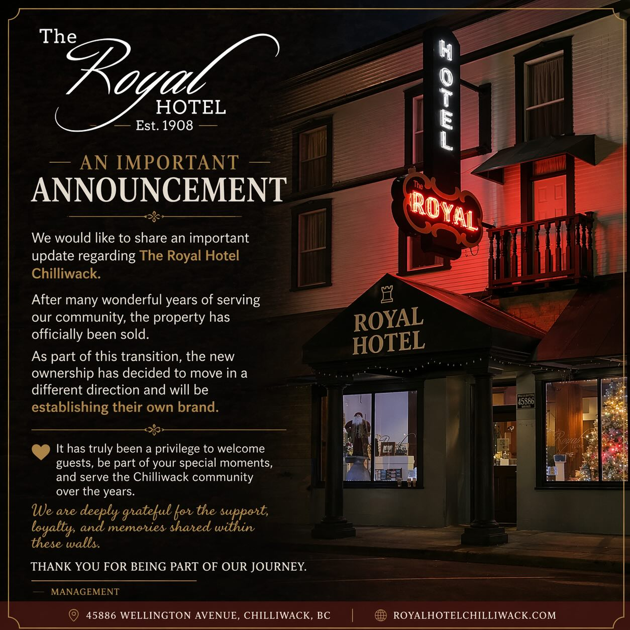 From Royal Hotel Chilliwack Facebook posting of April 24, 2026: To our valued guests and the Chilliwack community, We want to take a moment to sincerely apologize for the sudden nature of this transition and for any inconvenience or disappointment it may have caused.